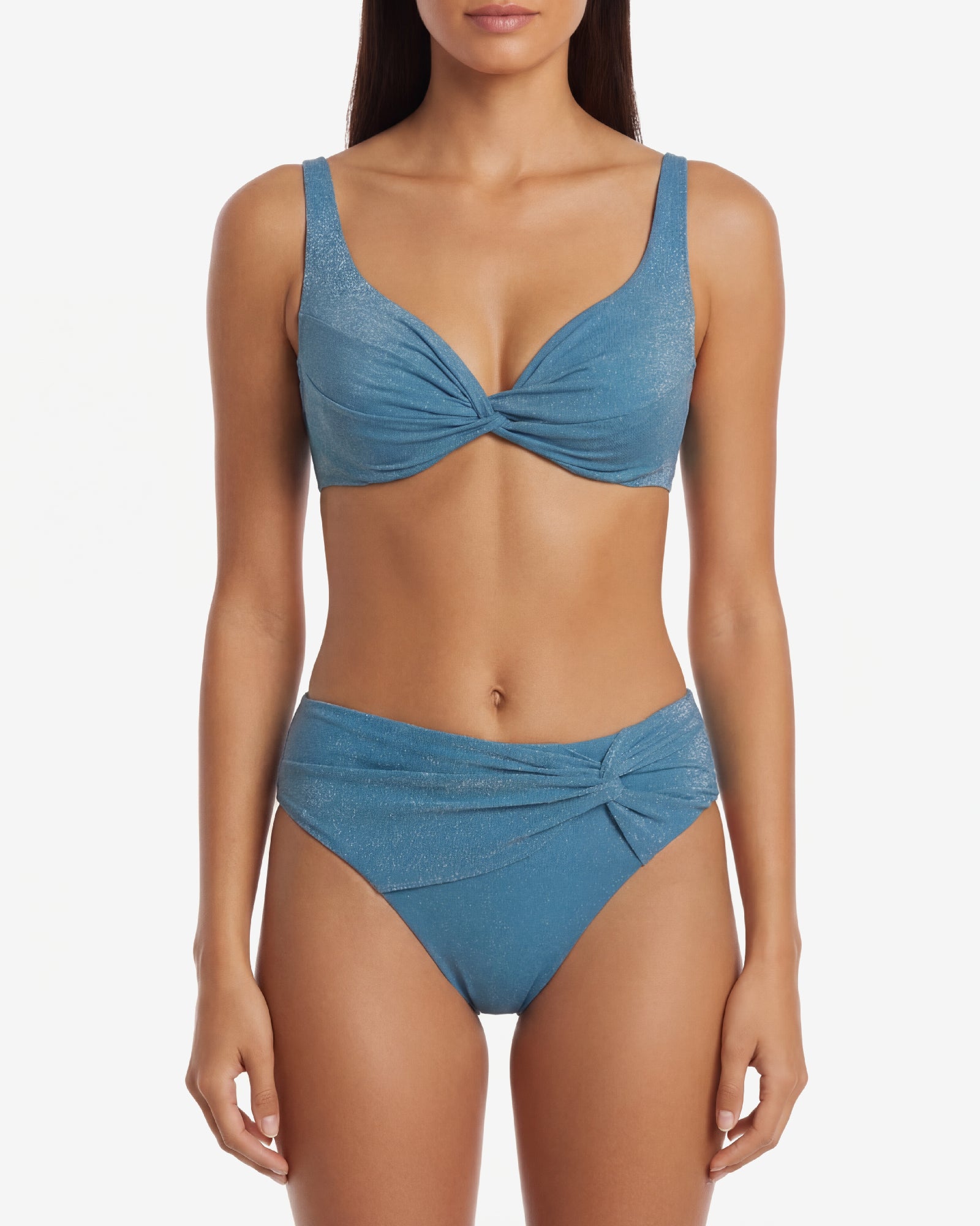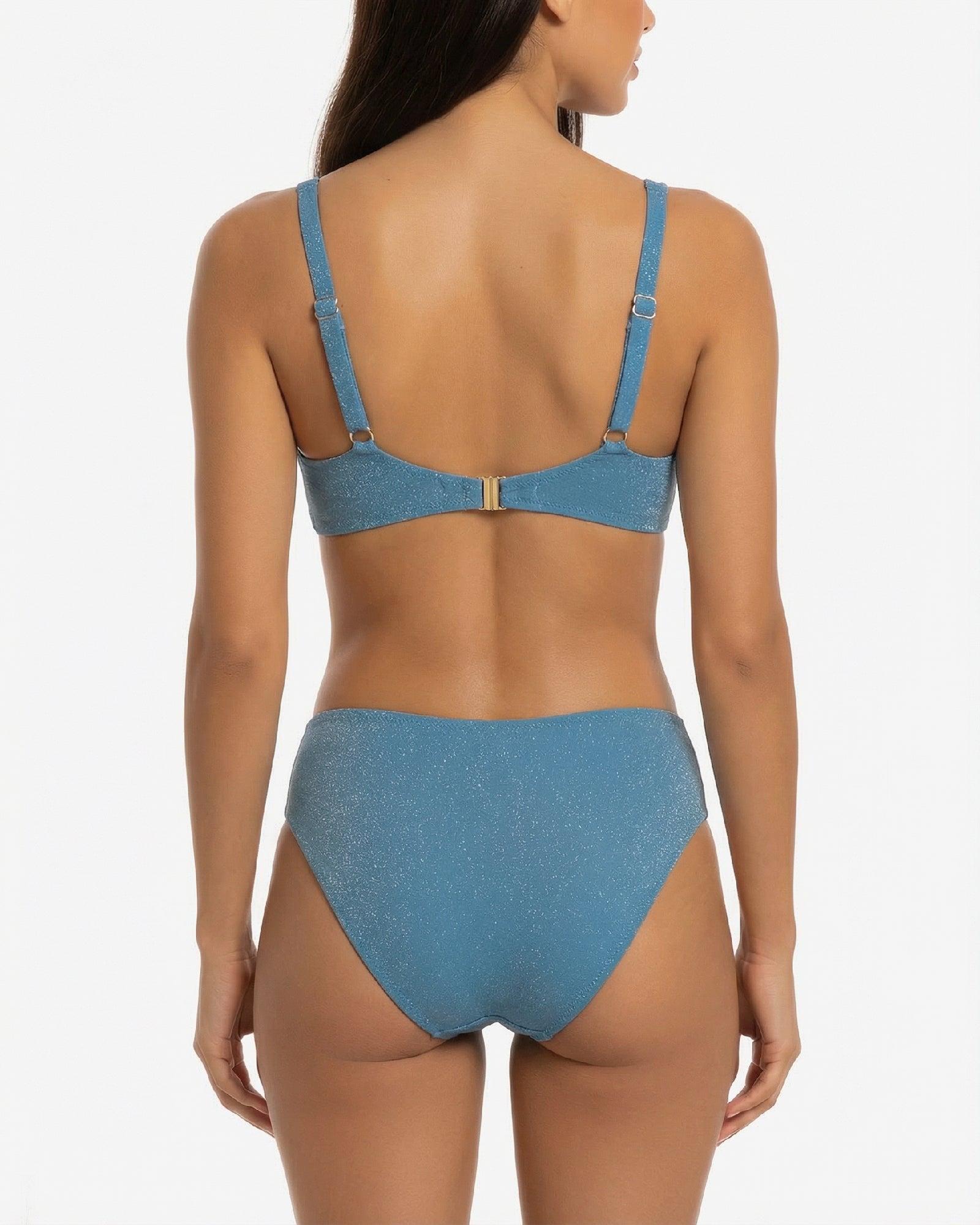 Il tessuto compatto con lurex nella tonalità mare esalta la luminosità della pelle, regalando un effetto fresco e sofisticato. Il top con ferretto modella con naturalezza offrendo comfort e stabilità, mentre lo slip con drappeggio laterale valorizza la figura con armonia e sobria eleganza.