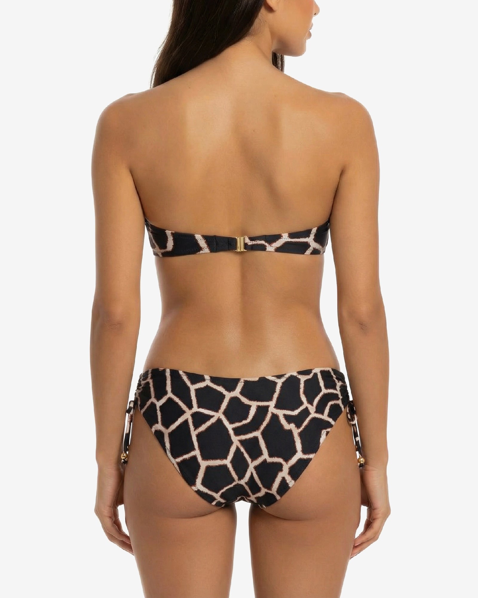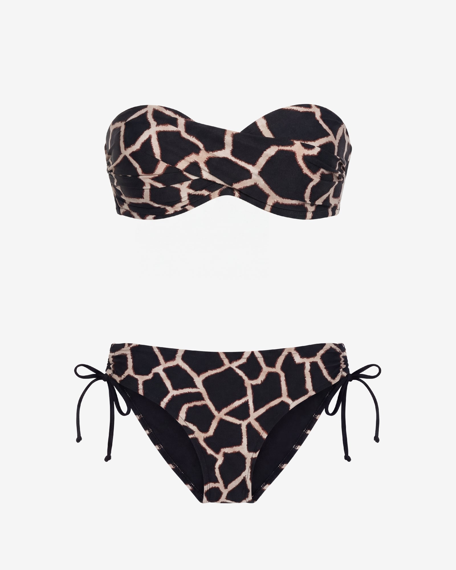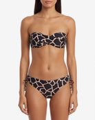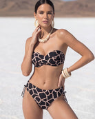 Black and sand giraffe print fixed padded underwire bandeau with elegant center crossover that defines the neckline.