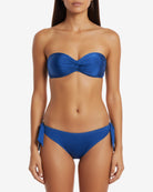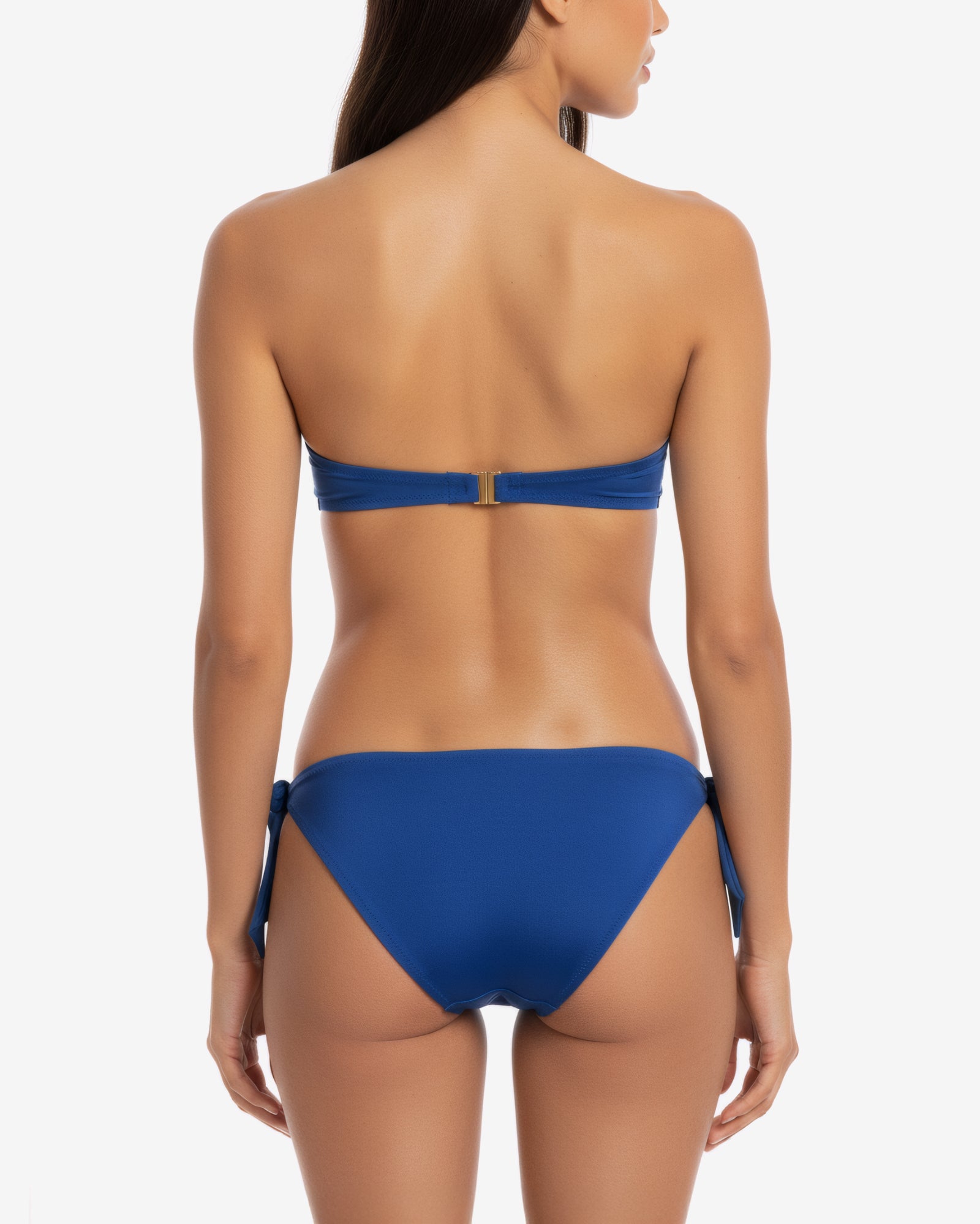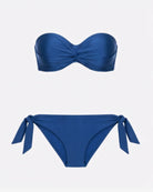 Elegante bikini a fascia blu cobalto con delicato drappeggio centrale che valorizza il décolleté. Lo slip con fiocchi laterali si adatta ai fianchi garantendo comfort, buona vestibilità e una linea pulita e femminile.