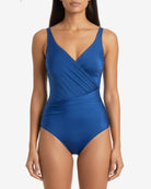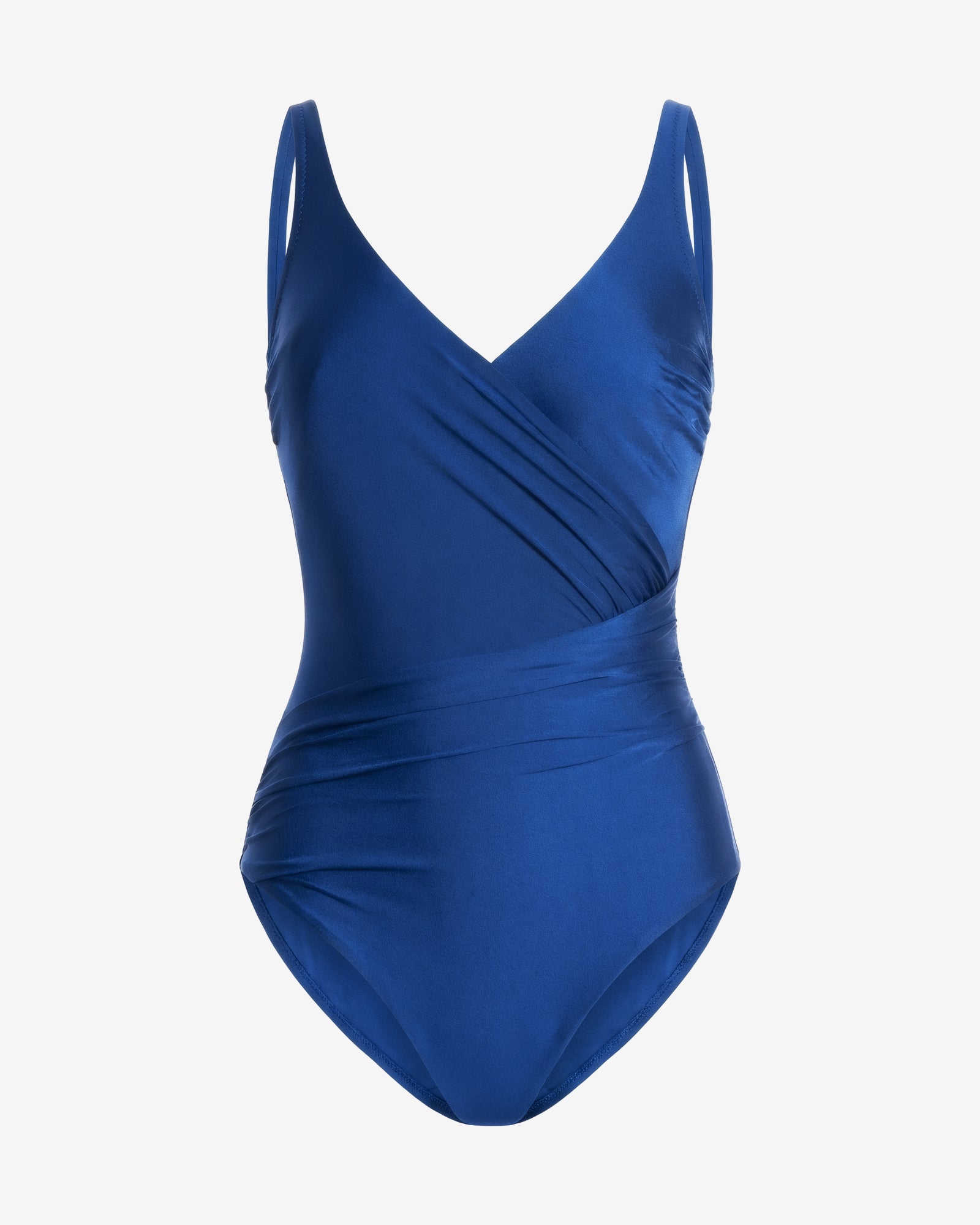 Elegante bañador de una pieza azul cobalto con escote cruzado que acompaña el escote y aporta sujeción gracias a los aros. Drapeado en la cintura que armoniza la silueta, suave tejido moldeador para un ajuste cómodo y femenino.
