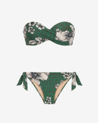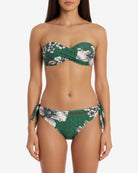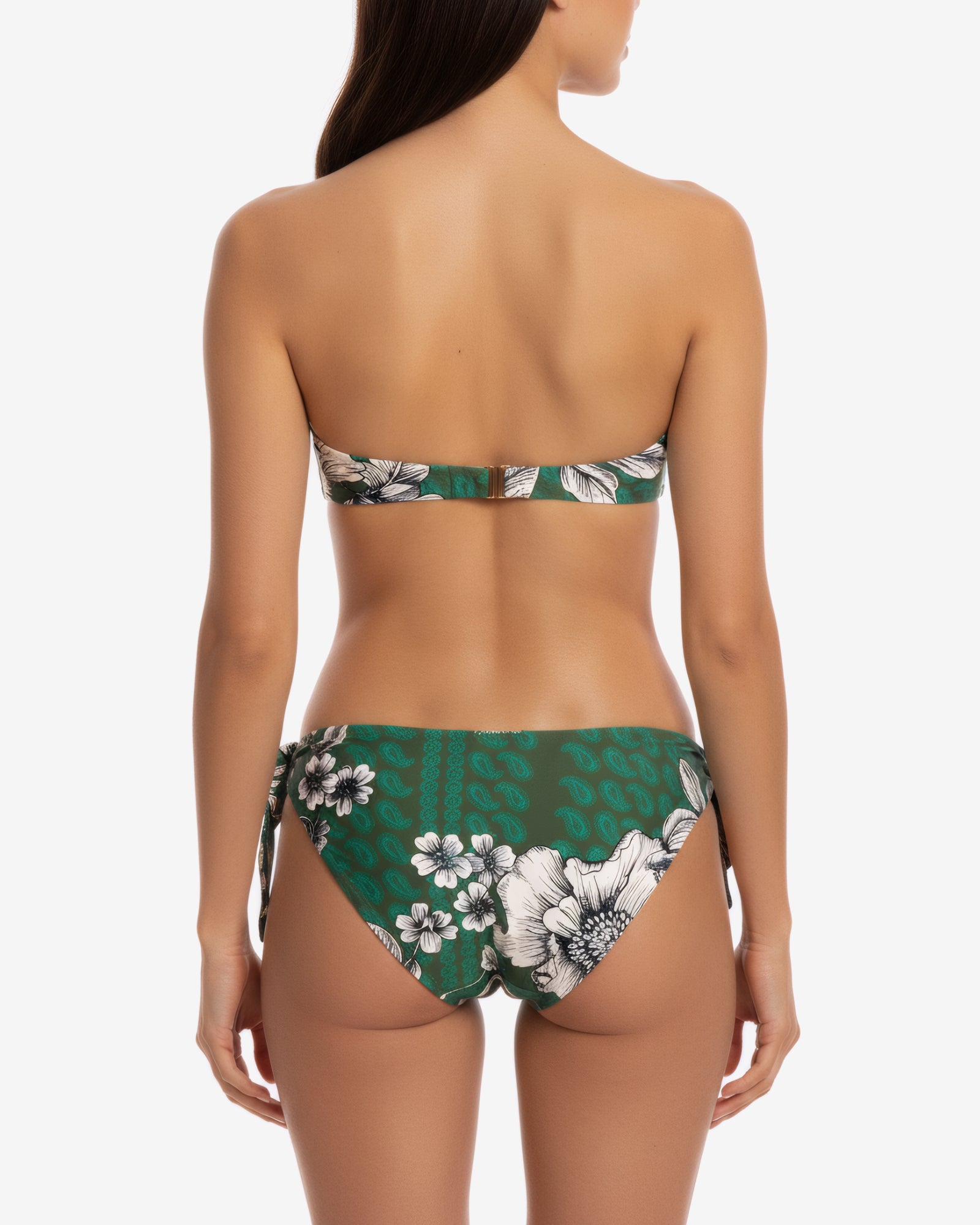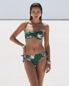 Bikini bandeau raffiné avec armatures et rembourrage fixe en vert forêt, illuminé par de grandes fleurs ivoire et un micro-paisley. Bonnet drapé qui soutient le décolleté ; culotte avec nœuds décoratifs et ligne épurée pour un confort et un ajustement harmonieux.