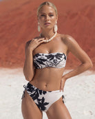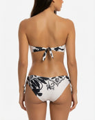 Le contraste marqué entre la base claire et le motif floral foncé confère équilibre et sophistication, mettant en valeur la silhouette avec un style discret. Le haut bandeau, avec ses bretelles amovibles, offre soutien et confort, tandis que la culotte à nouer sur le côté permet un ajustement parfait, garantissant une coupe harmonieuse et sophistiquée.