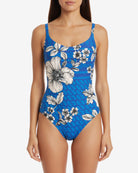 Le maillot de bain une pièce Corinne offre un soutien grâce à des armatures discrètes et un décolleté doux, épousant les lignes avec confort. Le bleu intense, agrémenté de fleurs graphiques contrastées, donne une élégance fraîche et élancée, adaptée à une féminité raffinée.